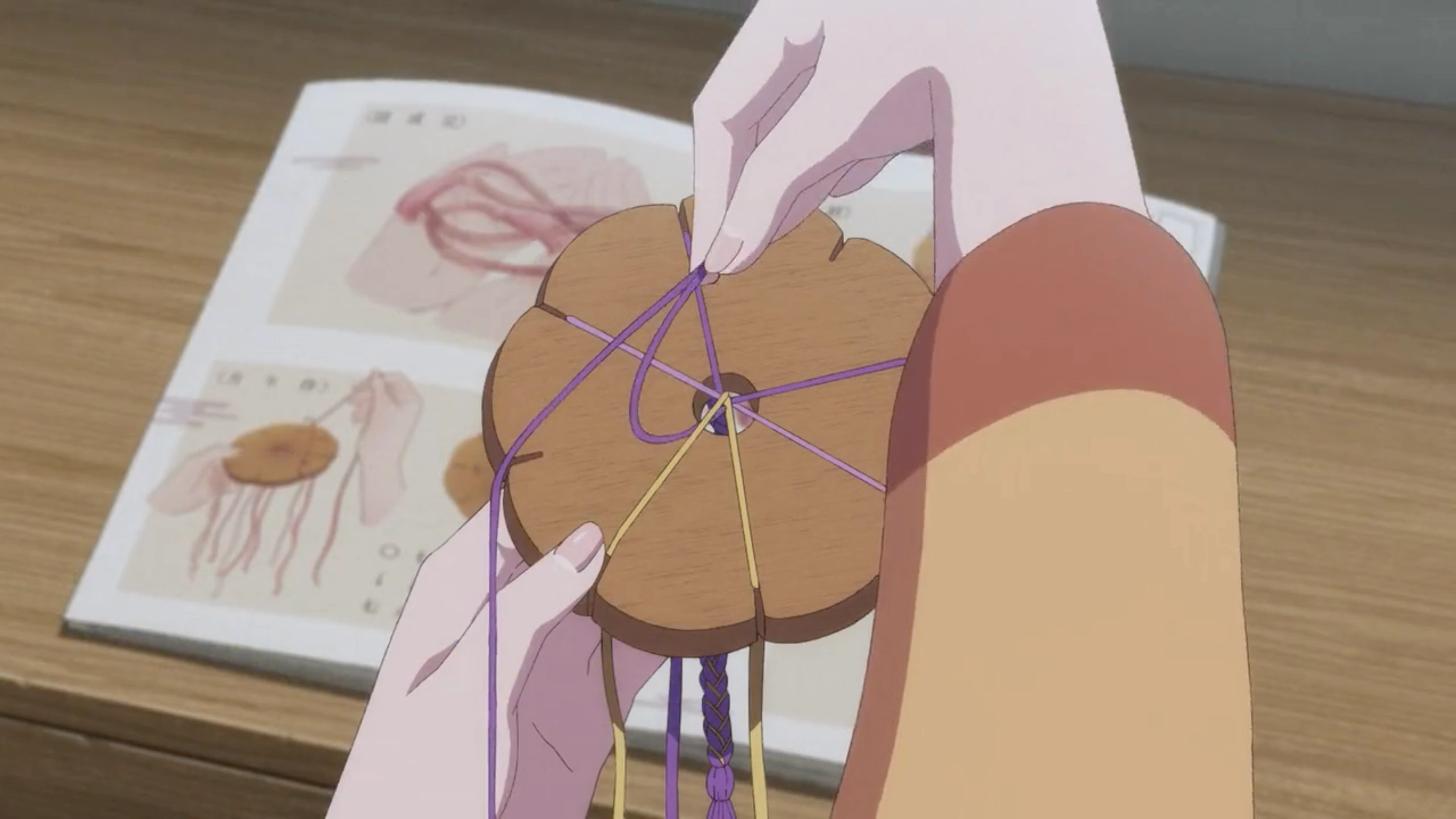 After returning from the city, Miyo stays holed up in her room for a week, feeling devastated after encountering her abusive half-sister Kaya Saimori in the city. During her hole up, she finishes the hair tie for Kiyoka. It is a gorgeous cord with stunning braiding, an excellent work for an amateur. Then she uses leftover threads to construct another braided cord using a different pattern, an excuse to stay holed up in her room.[1]